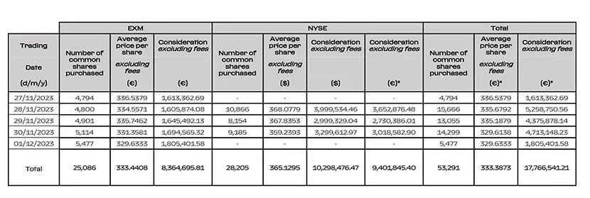 - Euro 29,891,981.49 for No. 91,243 common shares purchased on the EXM
