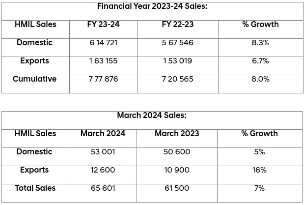 HMI reports highest ever annual total sales of 7.77 Lakh Units in FY 2023-24, growth of 8%