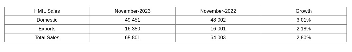 Gurugram, December 1, 2023: Hyundai Motor India Ltd. (HMIL), India’s first smart mobility solutions provider and largest exporter since inception, registered total sales of 65 801 units in November 2023. Total sales for the month of November 2023 include domestic sales of 49 451 units and export of 16 350 units.