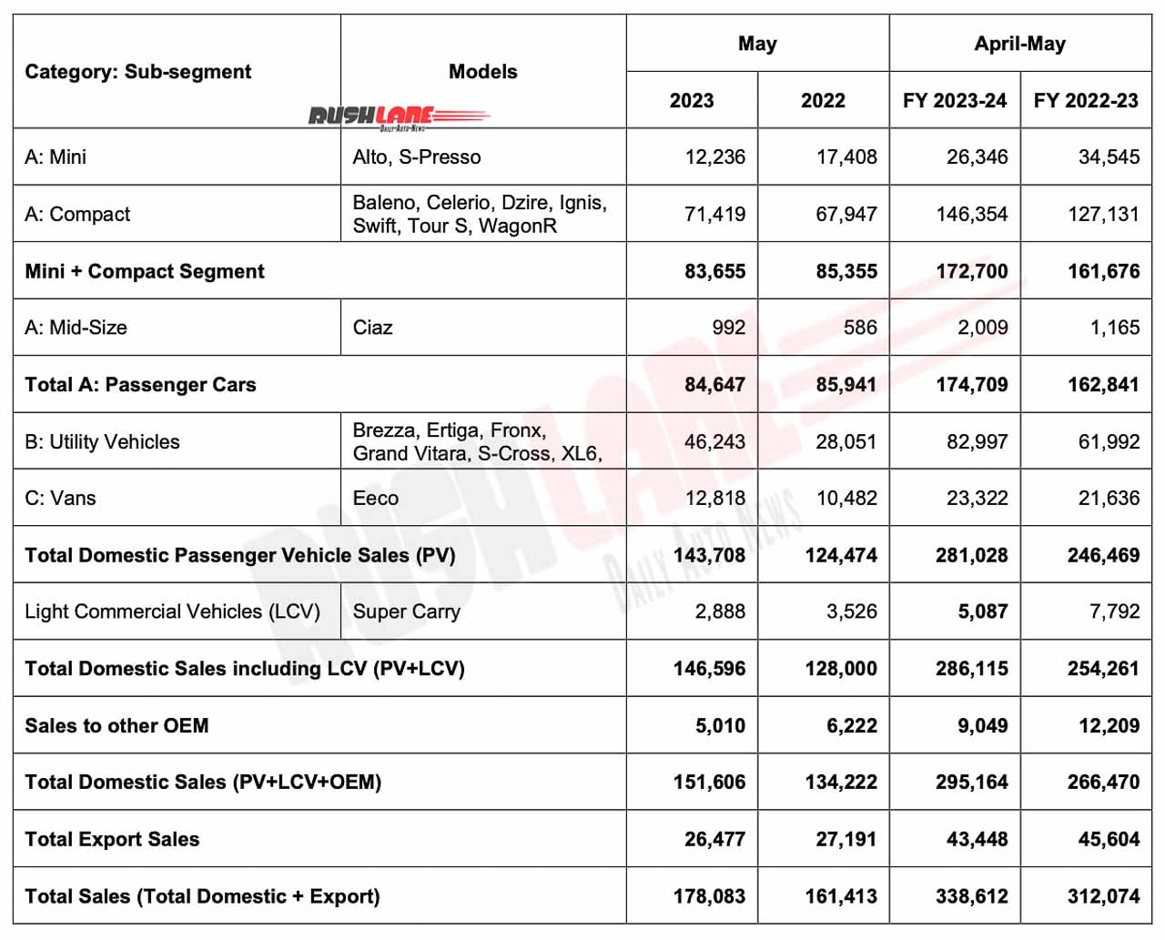 Taking sales in the passenger vehicle segment into account, the company had the Alto and S-Presso in the mini segment of which 12,236 units were sold last month. This was a YoY de-growth over 17,408 units sold in May 2022. YTD sales in the first two months of the financial year – April-May 2023 also dipped to 26,346 units from 34,545 units sold in the same period of 2022.