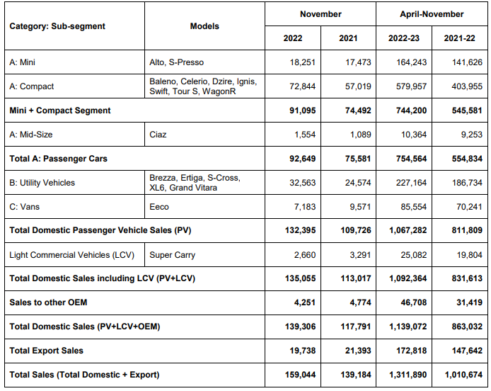 New Delhi, Maruti Suzuki India Limited sold a total of 159,044 units in November 2022. Total sales in the month include domestic sales of 135,055 units, sales to other OEM of 4,251 units and exports of 19,738 units.