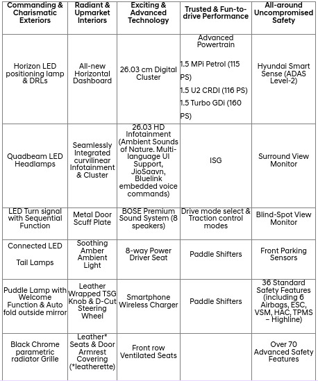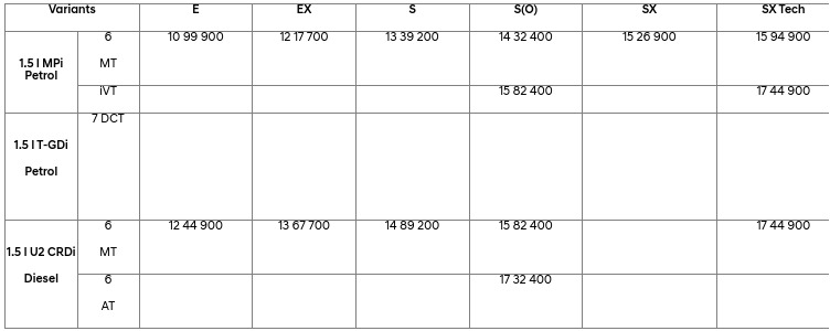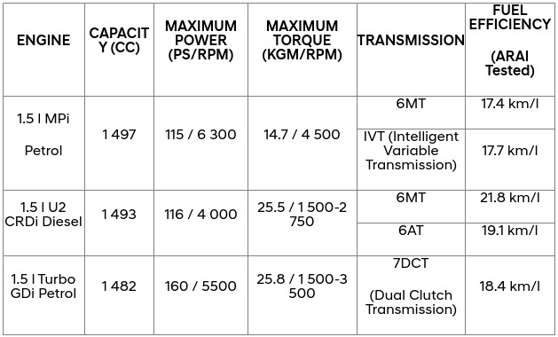 Hyundai is offering 5 Powertrain Options including 1 New Powertrain - 1.5 l MPi Petrol (6MT/ IVT); 1.5 l U2 CRDi Diesel (6MT/ 6AT); New 1.5 l Turbo GDi Petrol (7DCT)